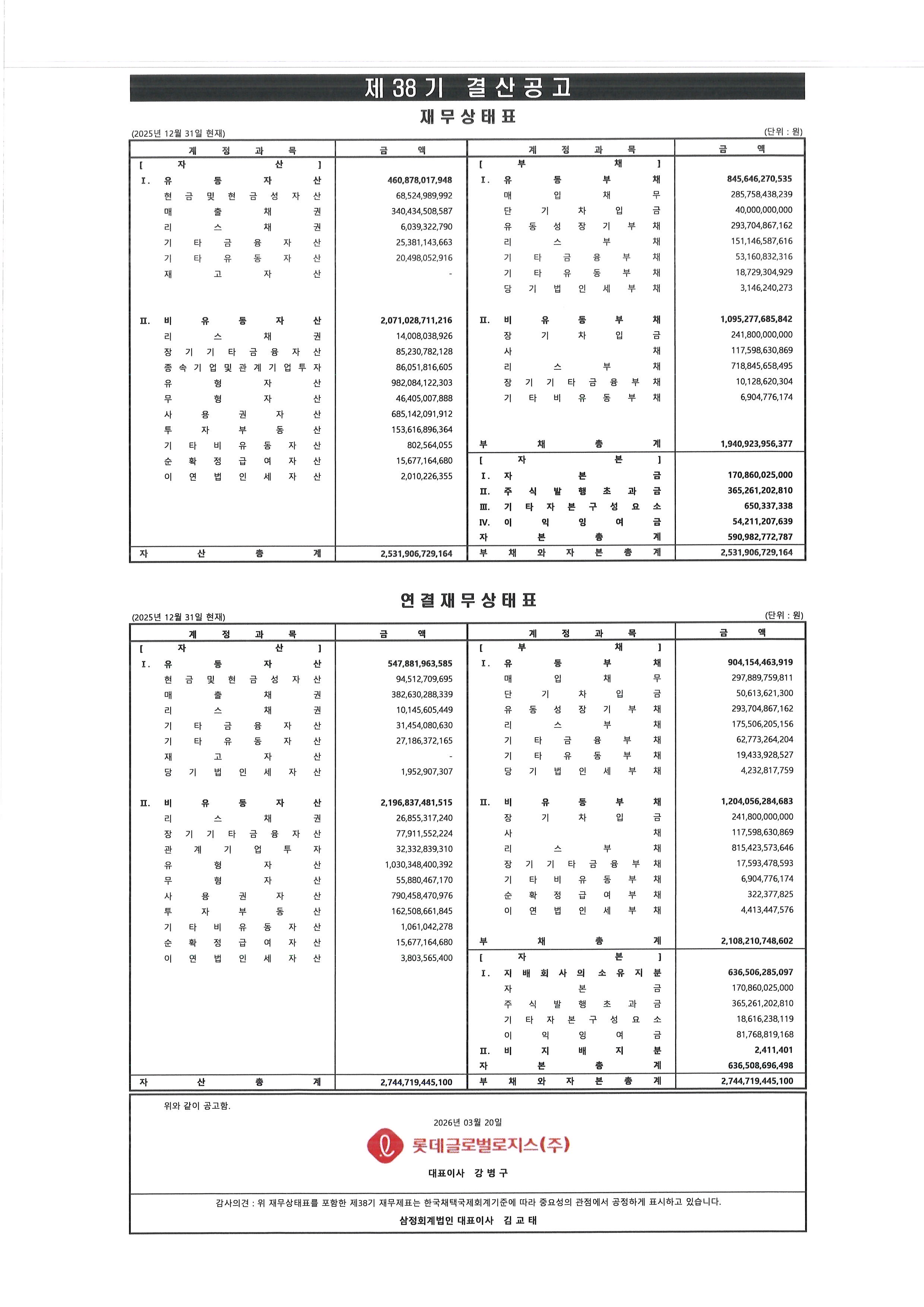 롯데글로벌로지스 제38기 결산공고(2025년)