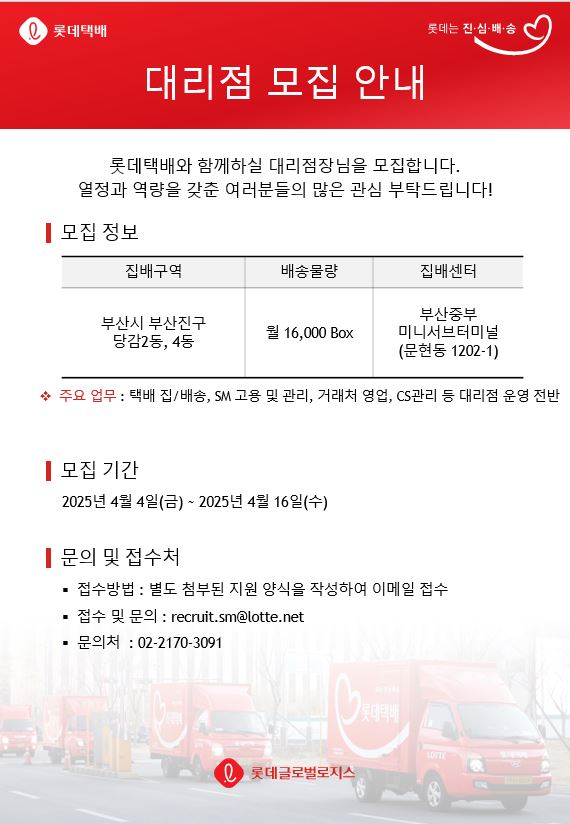 롯데택배 집배대리점 모집을 아래와 같이 공고하오니, 많은 관심과 지원 부탁드립니다.