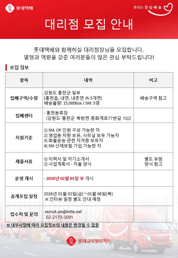 롯데택배 대리점 모집 안내 (강원도 홍천군 일부)