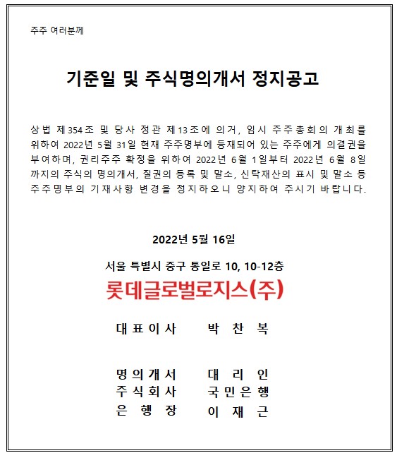 2022년 임시주주총회 기준일 및 주식명의개서 정지공고