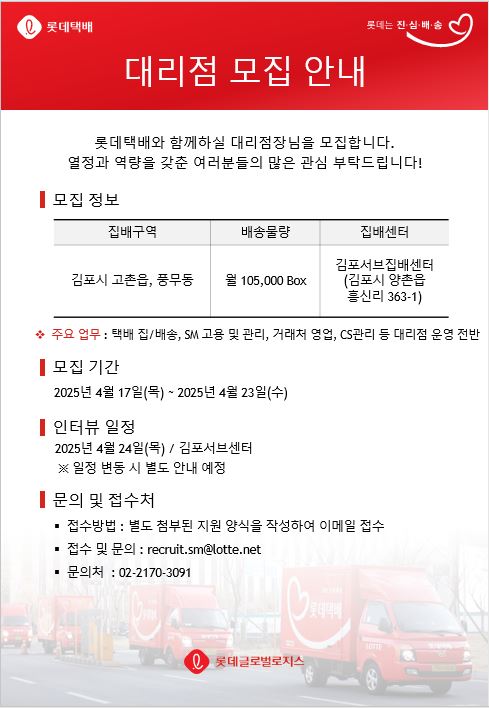 롯데택배 대리점 모집 안내 (김포시 풍무동, 고촌읍)
